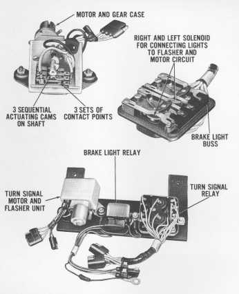 When the turn signal switch is actuated, either right or left, a circuit is completed to the turn signal relay to the respective right or left side solenoid. A set of four contact points is actuated by the solenoid to connect the rear lights to the flasher and motor circuit. Three contacts connect the three rear lights and one contact connects the front turn light.